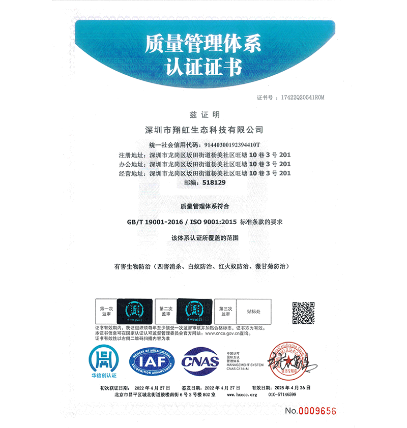 深圳市翔虹生態(tài)科技有限公司成立于1995年,是深圳最早成立的專業(yè)蟲(chóng)害防治公司之一。公司發(fā)展至今獲得全國(guó)有害生物防制服務(wù)A級(jí)資質(zhì)、廣東省有害生物防制服務(wù)A級(jí)資質(zhì)、深圳市有害生物防制服務(wù)A級(jí)資質(zhì)、廣東省有害生物防制服務(wù)A級(jí)資質(zhì)、深圳市有害生物防制服務(wù)甲級(jí)資質(zhì)的單位,是中國(guó)有害生物防治協(xié)會(huì)會(huì)員、廣東省有害生物防治協(xié)會(huì)會(huì)員、深圳市有害生物防治協(xié)會(huì)理事單位,多次獲得“深圳市十佳消殺單位”榮譽(yù)。